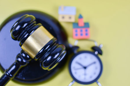 Judge's gavel beside model houses on yellow background symbolizes legal authority in property ownership, housing disputes, or real estate regulation.