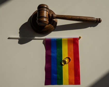 Legalization of same-sex marriages. Rainbow flag wedding rings and judges gavel.
