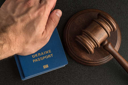 Male hand holds a Ukraine passport next to the judge's gavel. Obtain citizenship