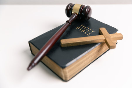 Judge's gavel and holy bible book on wooden table