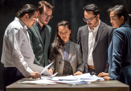 Questions around. Young colleagues working together in a office styled like classical artworks. Look busy, attented, successful. Medieval, renaissance mood. Concept of business, office, finance.