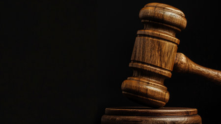 A judge's gavel resting on a wooden surface against a dark, unfocused background