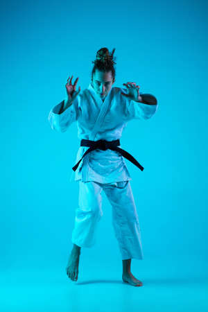Attack. Professional female judoist in white judo kimono practicing and training isolated on blue neoned studio background. Grace of motion and action. Healthy lifestyle, sport concept