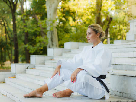 Portrait of young woman in white kimono with black belt. Sport woman sitting on stairs outdoors. Martial arts