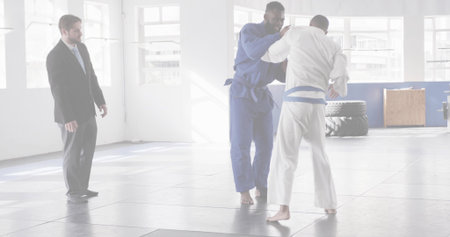 Two judo fighters showing technical skill while practicing martial arts in a fight club. The two fit men in uniform. fight, karate, training, arts, athlete, competition concept