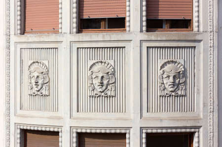 RIGA, LATVIA - JULY 11, 2017: Bas reliefs on facade of buildings in Art Nouveau style, located in historical Quiet Center on Elizabetes street.
