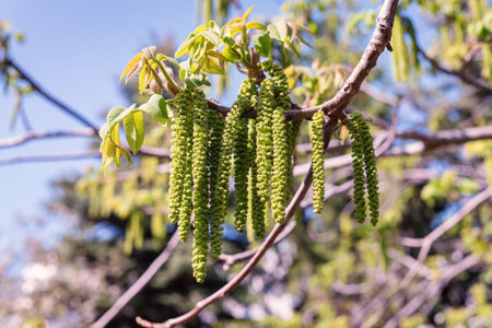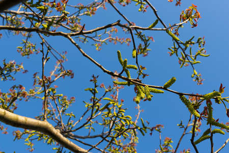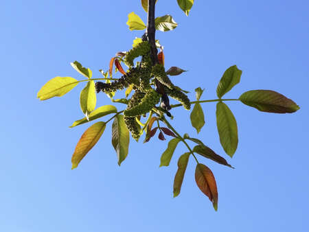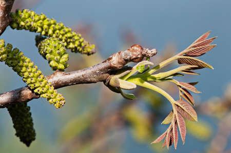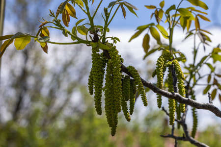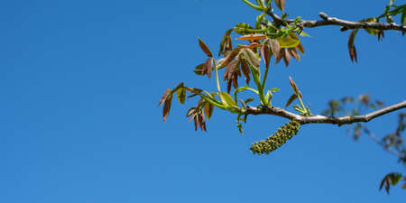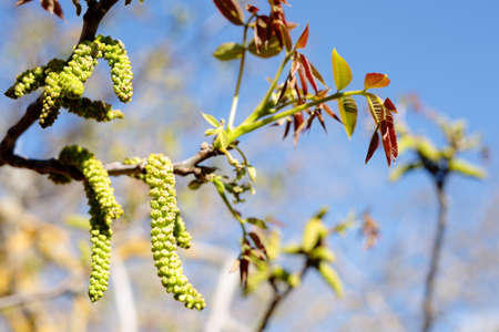 Flowering walnut catkins and young leaves in early spring with the sky in the background. Walnut flowering period