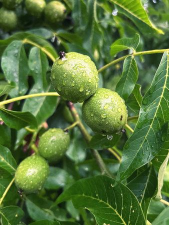green walnuts on the tree, nuts fruits in shells wet from the rain, ripening nuts, walnut tree in the rain