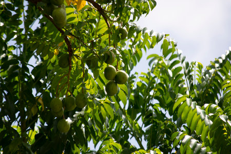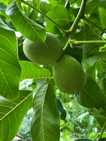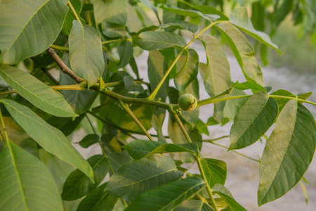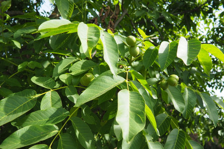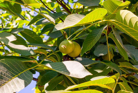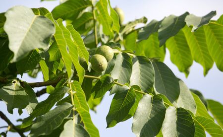 Juglans regia tree branches, unripened green fruits nuts and leaves on persian walnut tree in daylight
