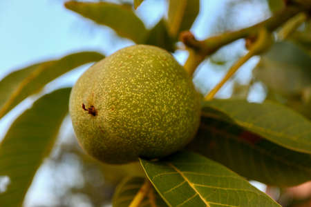 Close up of walnut fruit growing on tree with blured background. Vegetarian food background