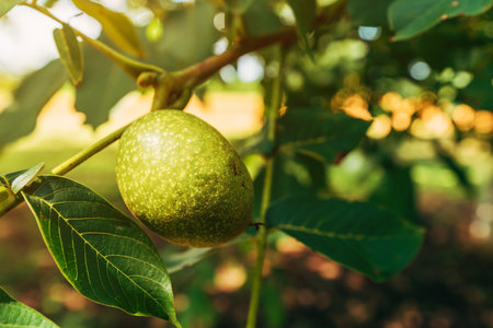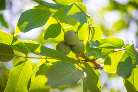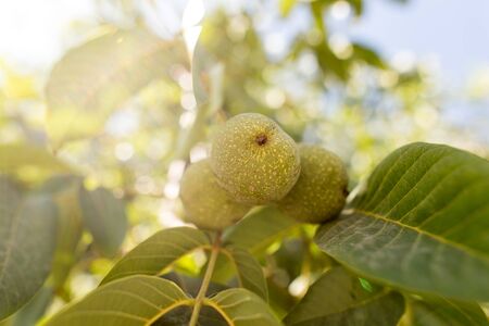 Green walnuts ripen, on branch of tree with green leaves close-up with rays of bright sun. Concept of growing