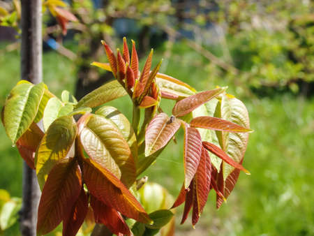 Sprouting leaves of a walnut tree in springtime. Young walnut leaves on a green background. Spring image of a tender sprout of a young nut, close-up.