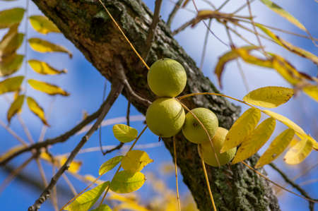 Juglans nigra green unripened nuts on bare branches in fat husk against blue sky, autumnal color leaves