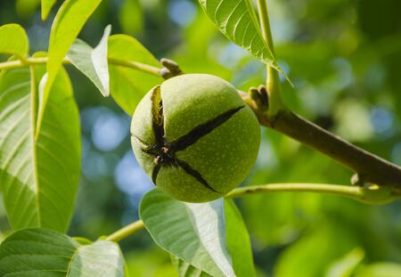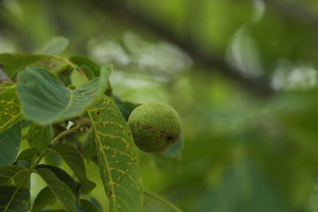 Unripe green walnut on a tree branch. Waiting for a good harvest of nuts.