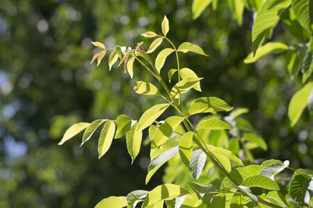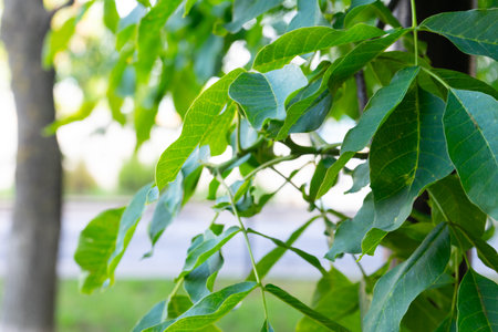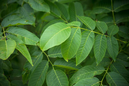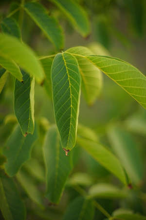 Green walnut leaves close-up on blurred background