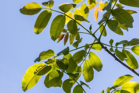 Walnut tree branches with green leaves on sky background in sunny weather