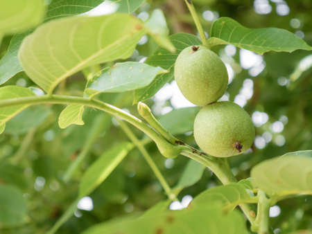 Unripe green walnuts to be on a branch.Summer.