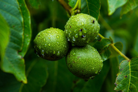 Green walnuts on the tree with drops of water on the leaves