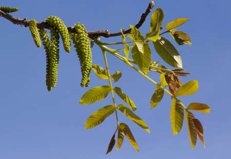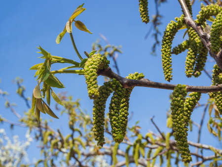 Walnut tree in blossom, male flowers on branches. Walnut tree in blossom, male flowers on branches. Sunny day, blue sky, early spring.