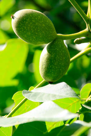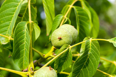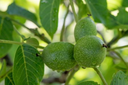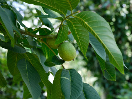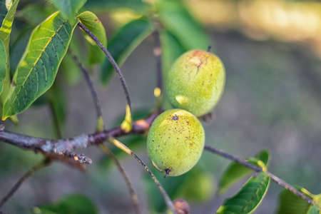 Close up of walnut fruit growing on tree with blured background. Vegetarian food background