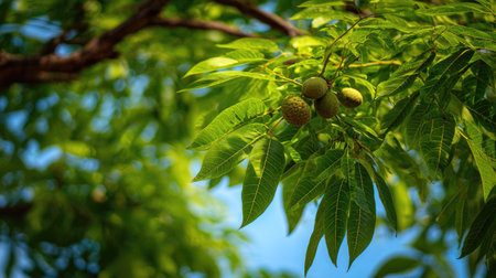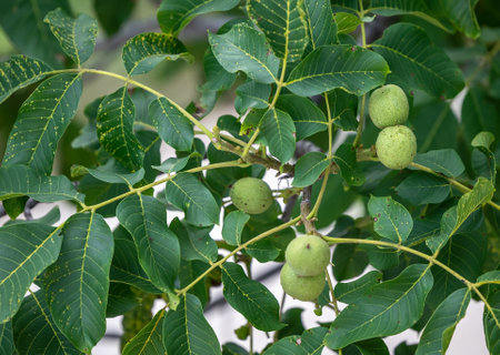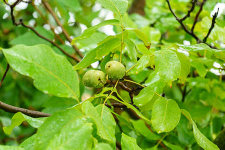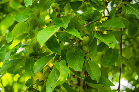 Walnut tree with green nuts and foliage in summer. food in the wild. close-up