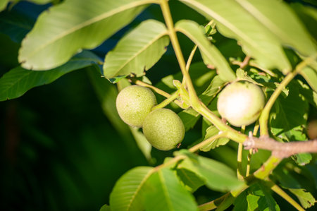 Three young green fruits of walnut hanging on a branch in a bright sunny day