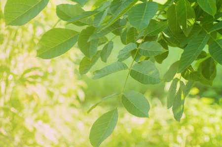 Green leaves on a blurred background on a sunny June day in the countryside.