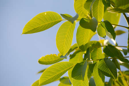 Spring blossoms tree walnuts with young green leaves on blue sky backgrounds, selective focus