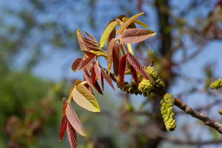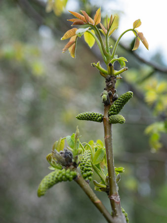 Walnut twig in spring, Walnut tree leaves and catkins close up. Walnut tree blooms, young leaves of the tree in the spring season, nature outdoors.