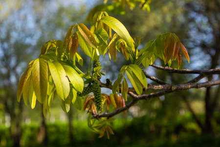 Walnut blooms in spring. Walnuts young leaves. Juglans regia in bloom, selective focus