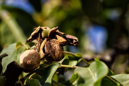 Branch of ripe open walnuts on tree in garden. Growing walnuts on the branch of a walnut tree in fruit garden, close up, Ukraine