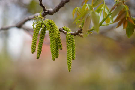 Blossoming walnut tree with hanging earrings. Flowering walnut tree.
