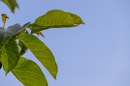 Photography on theme beautiful nut branch walnut tree with natural leaves under clean sky, photo consisting of nut branch walnut tree outdoors in rural, floral nut branch walnut tree in big garden