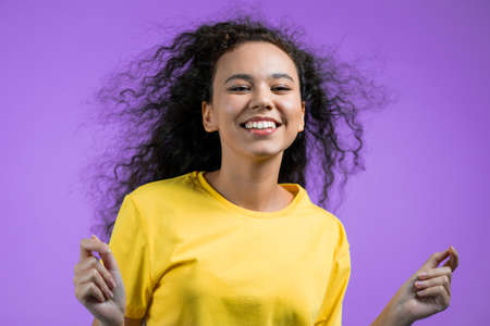 Portrait of cute woman on purple background. Positive young girl with waving natural curly hair, she smiles to camera.