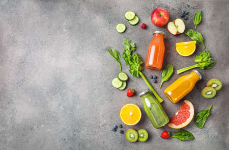 Variety of fresh colorful smoothies for detox weight loss diet. Juices in vacuum bottles with fruit, vegetables and greens ingredients, copy space. Vegan, vegetarian, clean eating, alkaline food