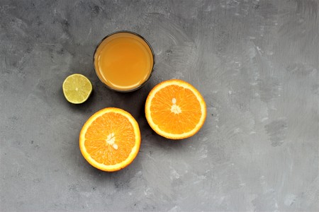 Freshly squeezed orange juice in a glass with fruits and vegetables on the table