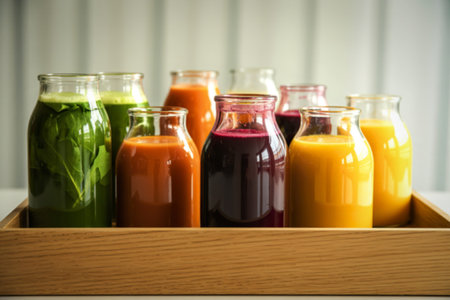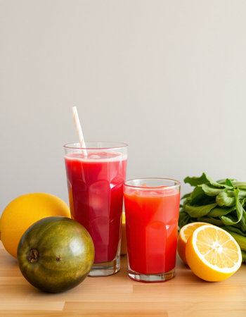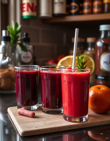 Fresh juices and sliced fruits on a kitchen counter with carrots and apples. That the image is generated using AI.