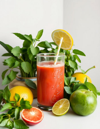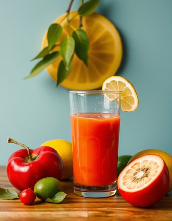 This image showcases a refreshing glass of citrus juice surrounded by vibrant slices of red grapefruit, orange, and lemon, perfect for a healthy lifestyle.