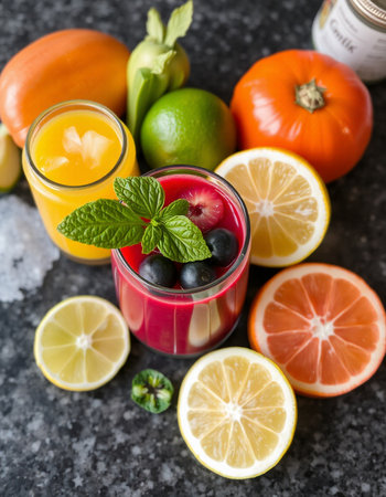 Two glass bottles filled with bright juices sit amid a lush display of oranges, blueberries, and raspberries, showing a delightful blend of colors and flavors in a summer-inspired feast.