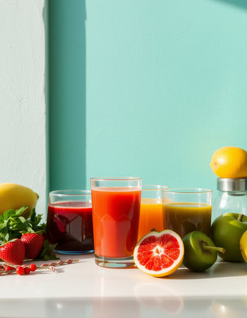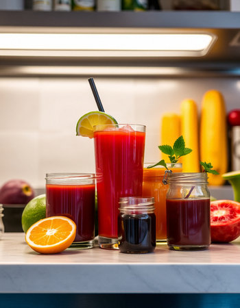 Glasses of fresh juice with fruits on the counter in the kitchen