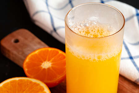 Freshly squeezed orange juice on a dark background. Healthy eating. Diet. Vegetarian food