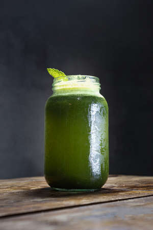 Homemade healthy green vegetable juice with ingredients on wooden table.