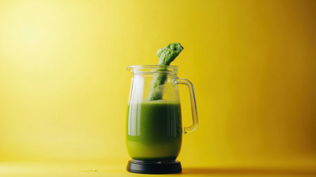 A refreshing green smoothie in a transparent jug set against a vibrant yellow backdrop. Perfect for wellness, healthy lifestyle, and nutritious diets.