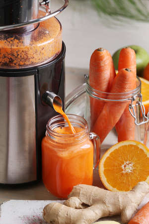 Detox drink. Freshly made Carrot Strawberry Orange Juice. For those who monitor their health