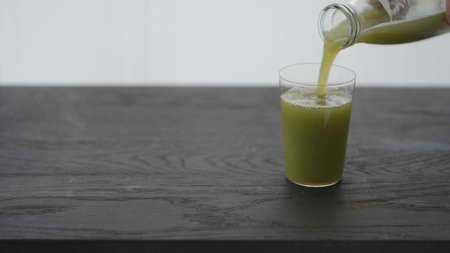 Female hand holding glass jar of fresh squeezed orange juice and pouring. selective focus