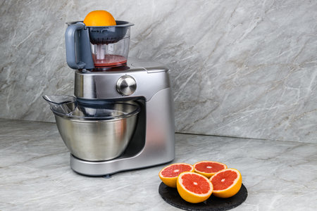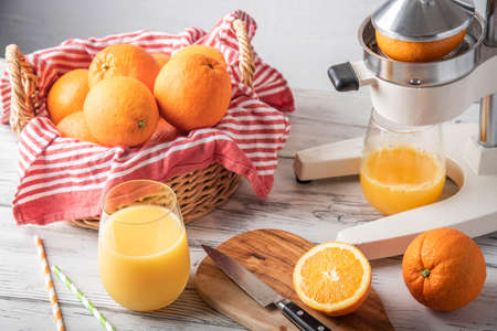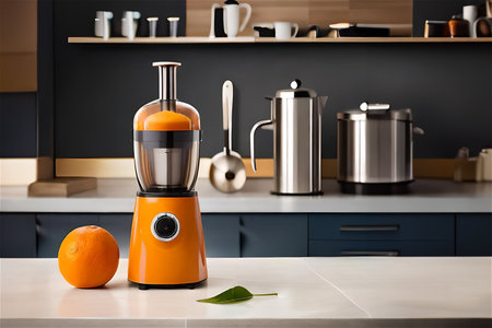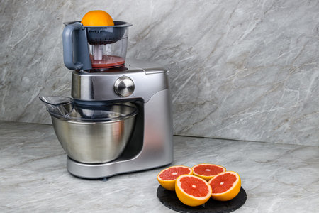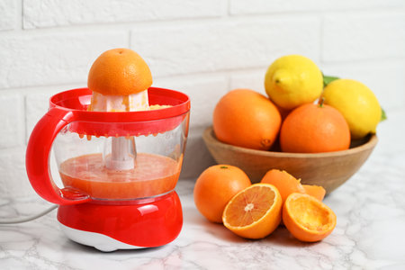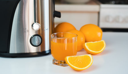 Modern electric juicer, oranges and freshly pressed juice on kitchen counter. Healthy lifestyle and detox concept. New year's resolution, fresh start, losing weight background.