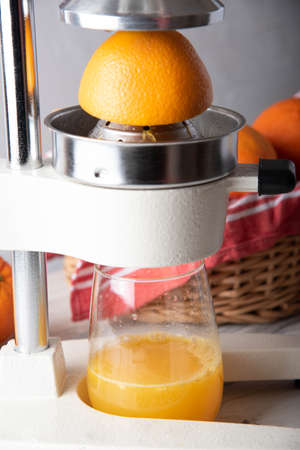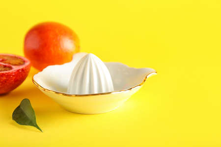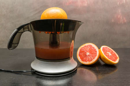 Citrus juice squeezer. Squeezed fresh grapefruit juice.