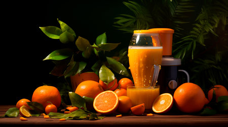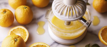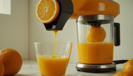 A close-up of a juicer extracting fresh orange juice into a glass, with oranges beside it. . --ar 16:7 --v 6.1 Job ID: aa282f99-c7a2-4775-816e-9be41636a900