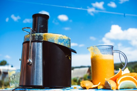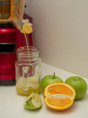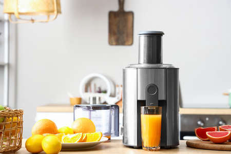 Freshly squeezed fruit juice and modern juicer on the table in the kitchen. Healthy juices at home. Close-up. Selective focus.