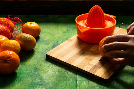 Man's hands making orange juice with a manual juicer on an old wooden background in green tones. Mediterranean diet concept